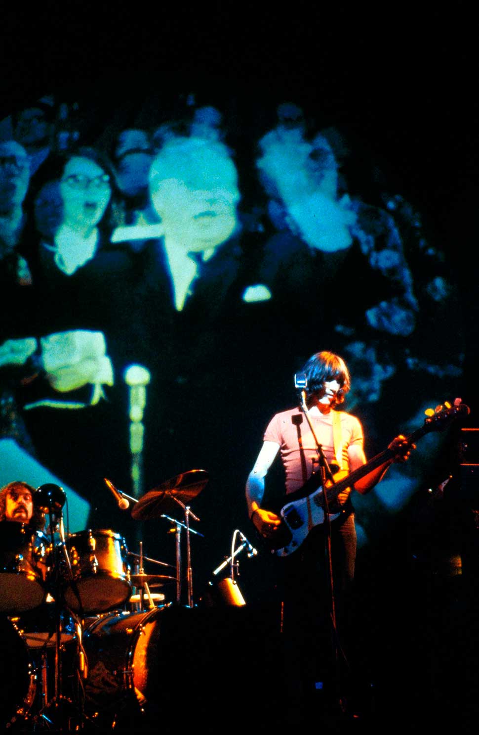 Significantly, the band also paid some serious attention to their stage presentation for the very first time that year. They may have still been performing Echoes and The Dark Side Of The Moon in their entirety, but now the show featured a 40-foot circular screen that was used to project specially prepared films onto. In one particularly memorable section, a sequence of flying animated clocks, created by Ian Emes, was used for the opening of Time. The screen also served as a backdrop at the close of Shine On, when a huge, rotating mirror-ball was raised in front of it and hit with a spotlight to produce blinding shards of white light, under cover of which the band exited the stage. Fireworks and rockets also provided some spectacular visual effects.