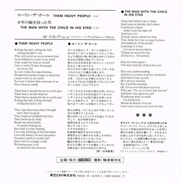 Moving had been released as a single in Japan four months earlier, with Wuthering Heights as the b-side, and while soul legend Al Green won the contest, Bush's success – she shared the festival's silver prize with Chicago soul act The Emotions, whose Best Of My Love single had topped the US chart the previous year – meant that local label EMI Music Japan were eager to capitalise.