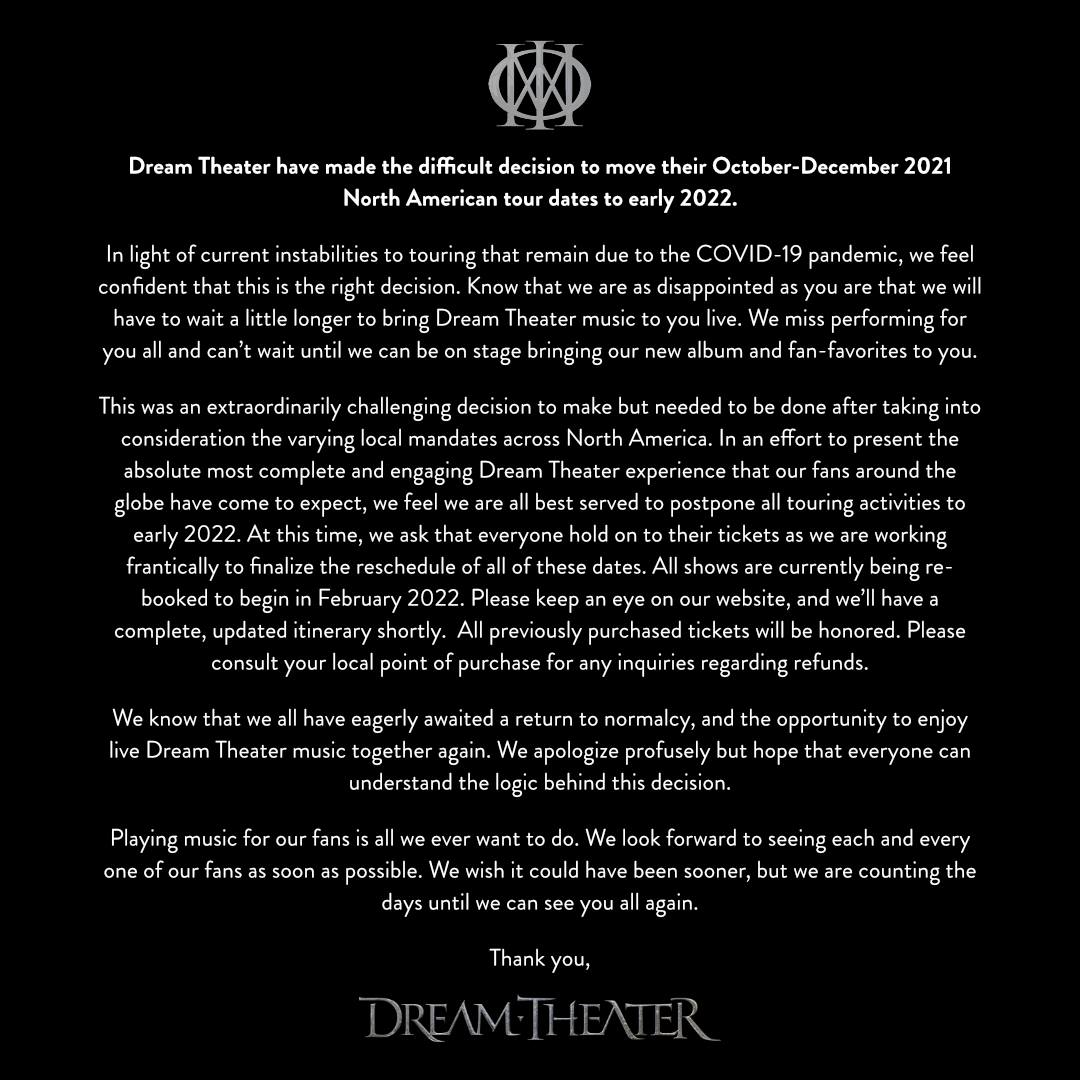 "Playing music for our fans is all we ever want to do. We look forward to seeing each and every one of our fans as soon as possible. We wish it could have been sooner, but we are counting the days until we can see you all again. Thank you, Dream Theater."